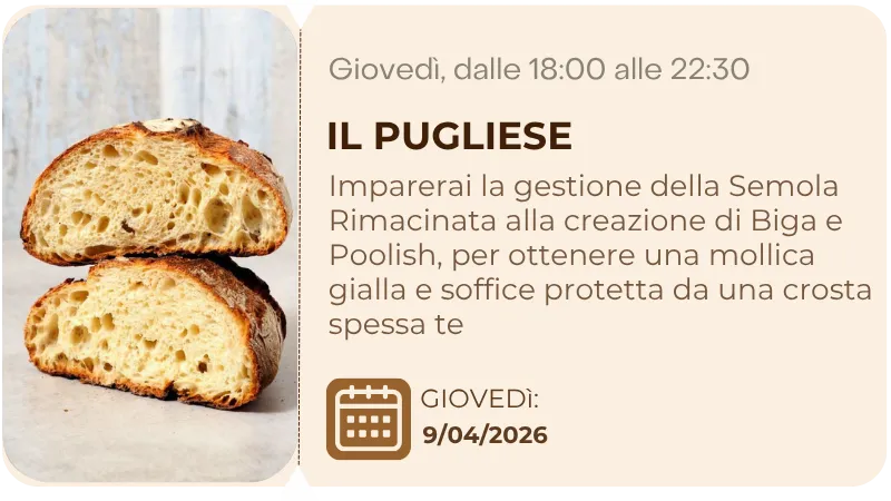 Dove lavorerai al fianco dello Chef Claudio Api e imparerai il metodo per ottenere un pane croccante fuori e perfettamente alveolato dentro, anche con il forno di casa tua.